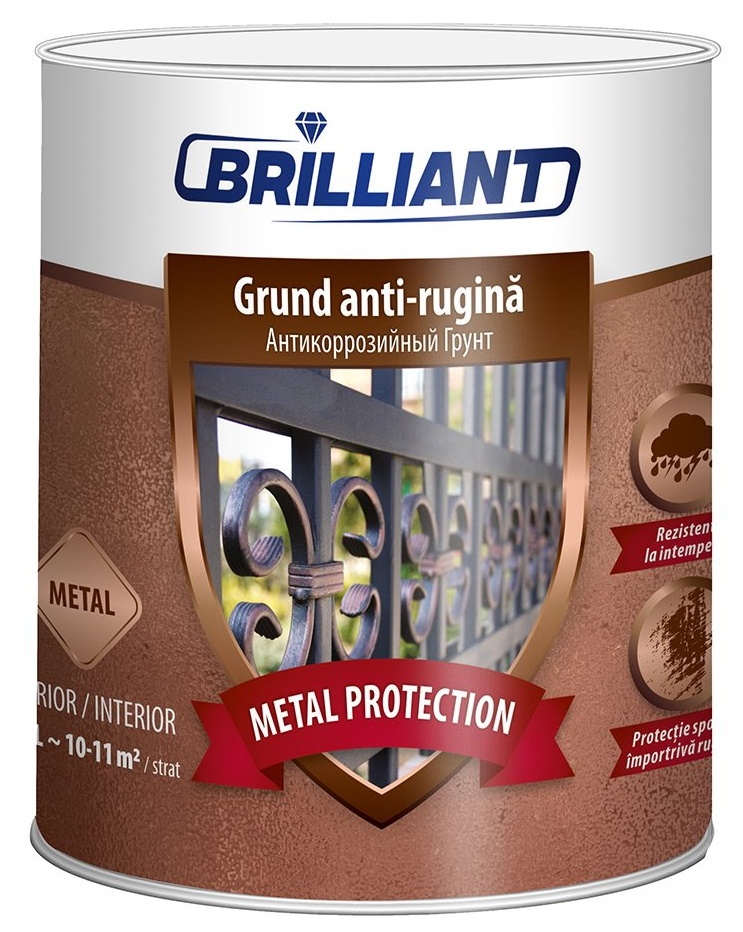 Brilliant Metal Protection — антикоррозийный грунт на основе алкидной смолы, органических растворителей, сиккативов, добавок; обеспечивает адгезию и используется для защиты металлических поверхностей. Рекомендуется для покрытия как новых поверхностей, так и для ремонта ранее окрашенных поверхностей.