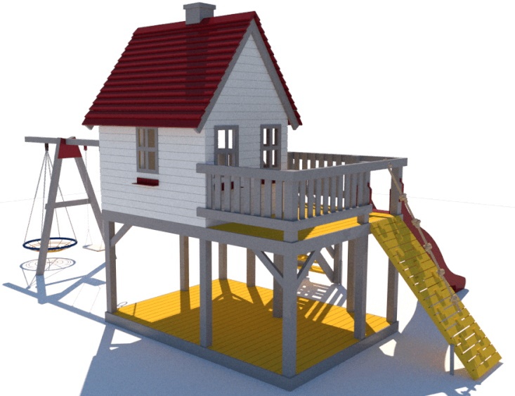Этот детский комплекс отлично подойдет вашему частному дому или идеально вольется в детскую площадку. Многофункциональный детский комплекс состоит из платформы с домиком, панели для скалолазания, горки, двух качелей, одна и которых "Аист", колец.
