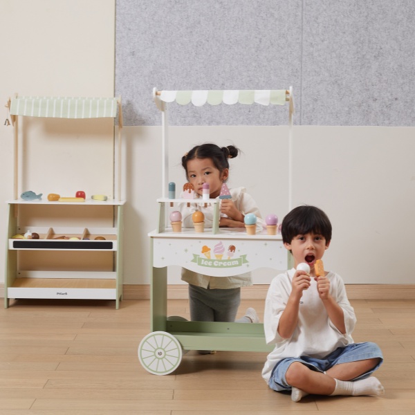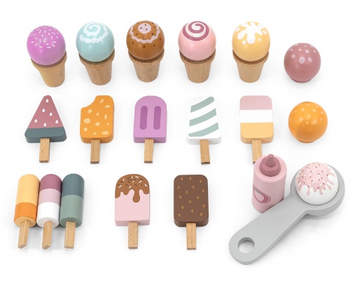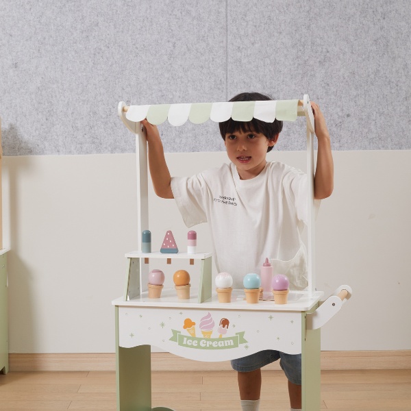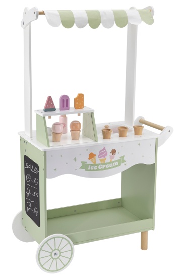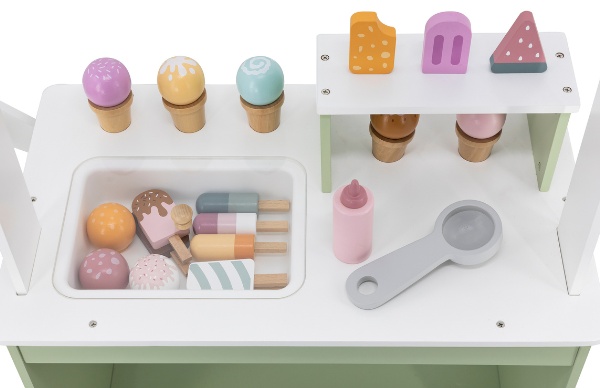 Большой деревянный магазин мороженого от Viga – это замечательный игровой набор, который обеспечит детям множество часов увлекательной игры. В комплект входят красиво выполненные детали, такие как мороженое, рожки, мороженое на палочке и даже магнитная ложка для мороженого, что делает игру еще более реалистичной. С помощью магнитной ложки можно свободно накладывать порции мороженого на рожки. На боковой стенке тележки находится доска для мелков, на которой можно записывать меню. Внизу тележки предусмотрена полка для хранения. Дополнительные колесики упрощают перемещение тележки с места на место.