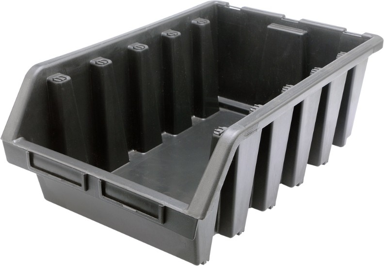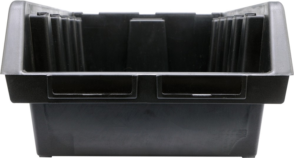 Складской контейнер размерами 33,3×50×18,7 см. Изготовлен из пластика черного цвета. Несколько контейнеров удобно вставляются один в другой, и благодаря этому не занимают много места на складе. Контейнер может использоваться различными коммунальными службами.