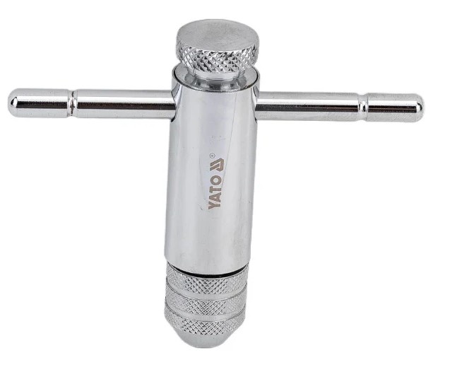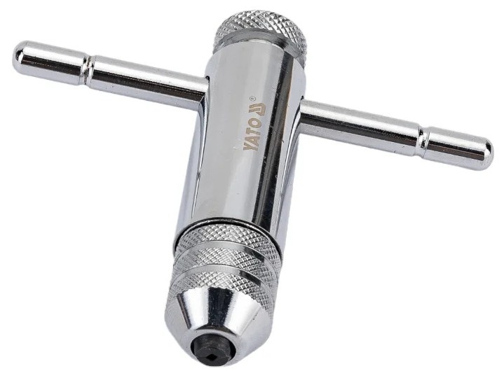 Вороток для метчиков M3-M10 с трещоткой YATO YT-2989 упрощает нарезание резьбы, поскольку трещотка сохраняет пройденный путь. Инструмент можно использовать одной ли обеими руками. Длина составляет 85 мм, что удобно для небольших диаметров.