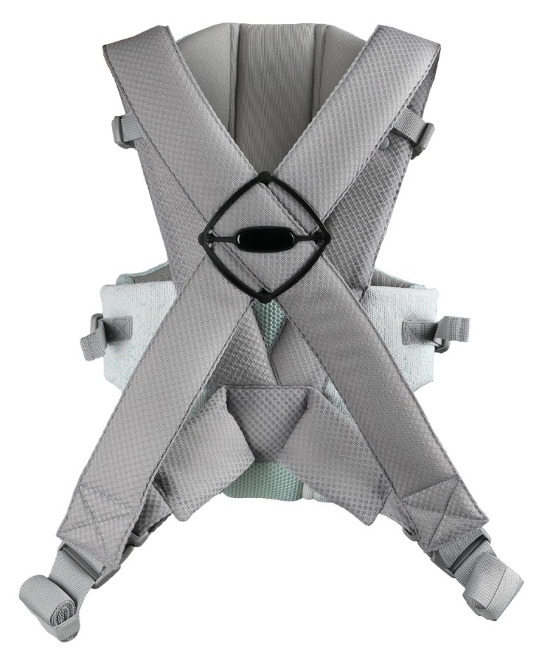 Механизм блокировки через плечо на спине родителя для предотвращения соскальзывания ремней.