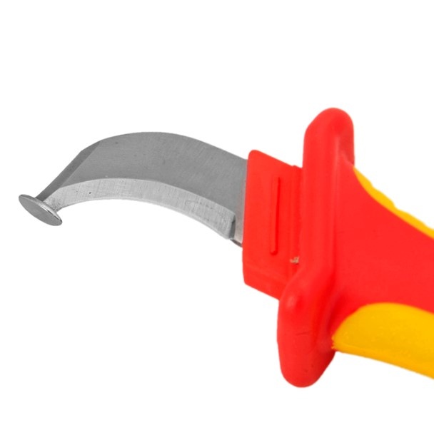 Исполнение: стабильное, неподвижное и серповидное крючкообразное лезвие. Башмакообразный наконечник жала ограничивает глубину разреза и предотвращает повреждение проводов. Защитный колпачок для безопасной транспортировки и защиты режущих кромок.