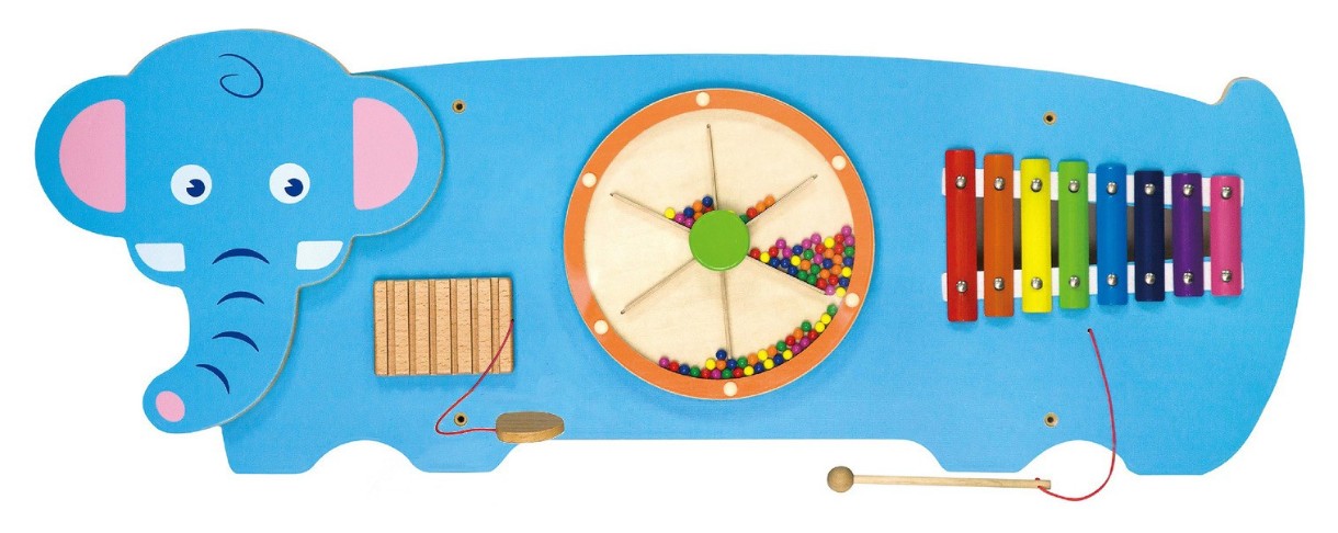 Слон - это многофункциональный настенный бизиборд для малышей. Большой, синий, милый, забавный Слоник порадует ребенка ксилофоном, трешеткой, закрытым колесом с бусинами.