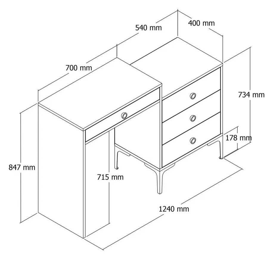 Туалетный столик спроектирован с учётом максимального комфорта. Вместительная тумба обеспечивает достаточно места для хранения косметики и аксессуаров, поддерживая порядок и лёгкий доступ. Пластиковая ручка добавляет современный акцент, а металлические ножки обеспечивают устойчивость. Высота ножек 17.8 см создаёт удобную и эргономичную посадку при использовании.