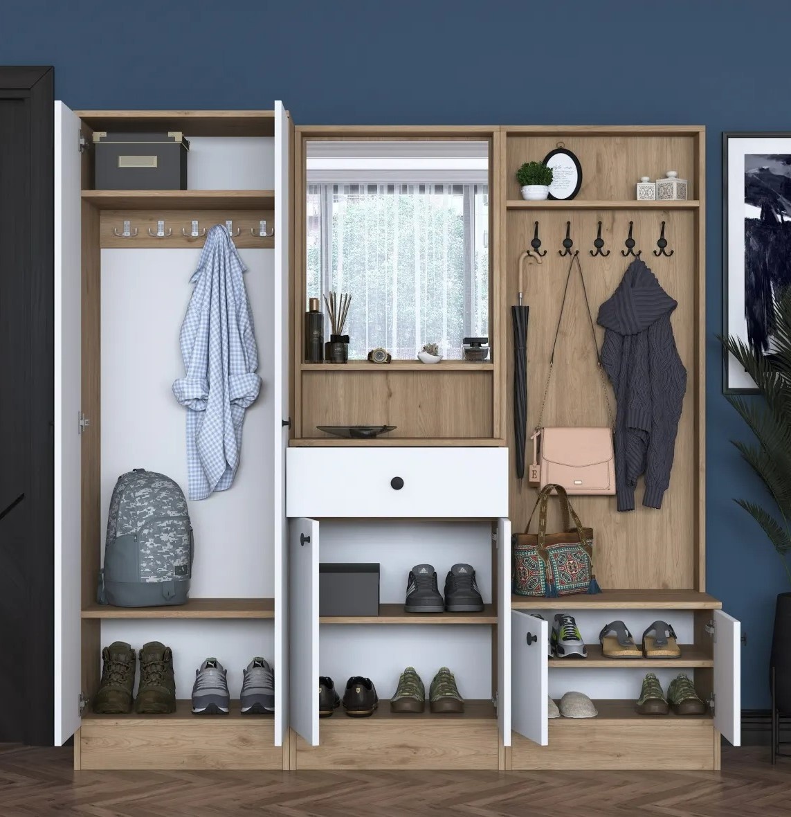 Создайте уютный и организованный вход с помощью этого функционального и стильного холла.