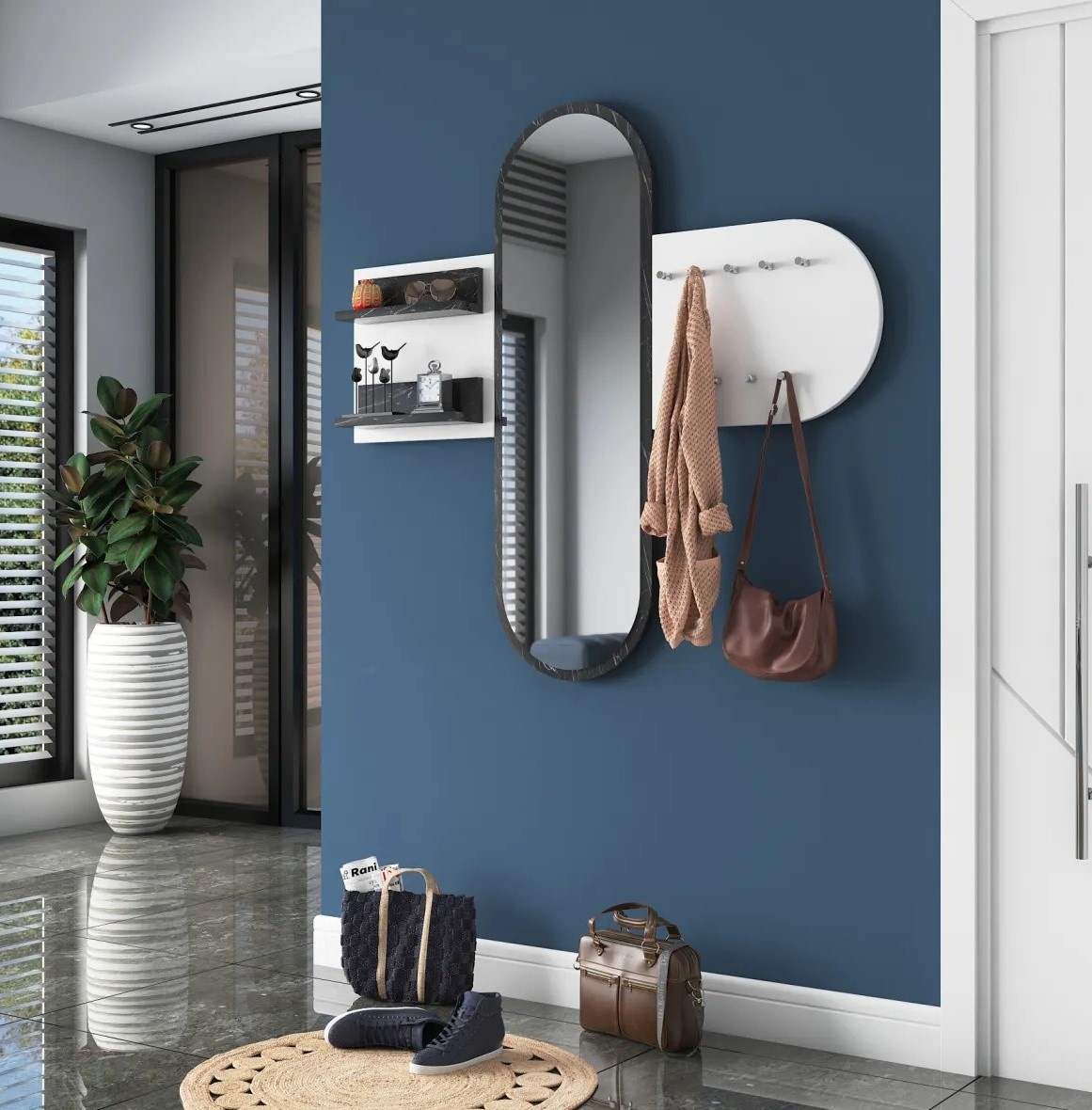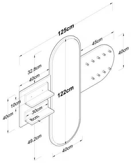 С множеством полок и многофункциональной настенной вешалкой, конструкция обеспечивает достаточно места для хранения ключей, сумок, головных уборов и шарфов. Два вместительных настенных блока шириной по 30 см позволяют удобно размещать декоративные элементы или хранить обувь.