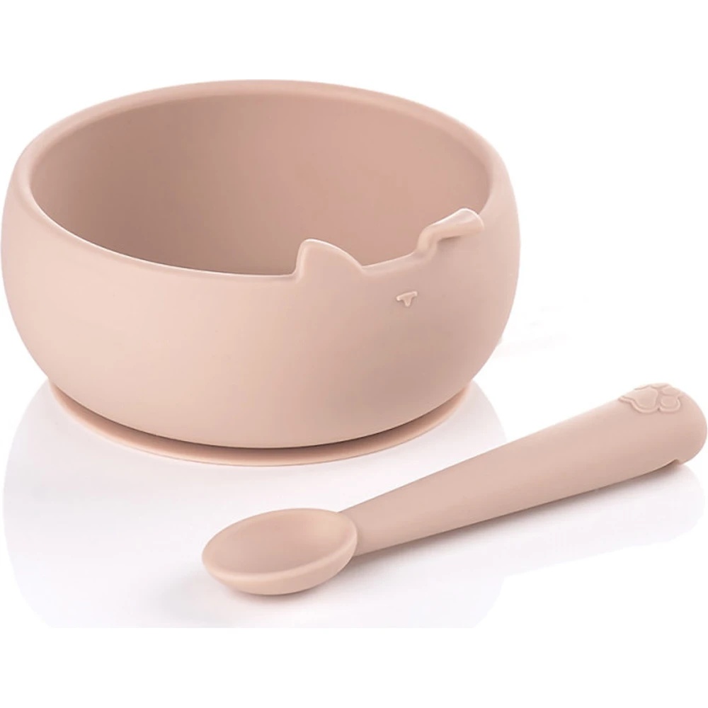 Ложка имеет эргономичный дизайн, который адаптируется к рукам ребёнка и помогает ему учиться есть самостоятельно. Миска остаётся на месте благодаря прочной присоске, плотно фиксирующейся на поверхности, что обеспечивает малышу больше безопасности и комфорта. Ушки на миске можно использовать как подставку для ложки.