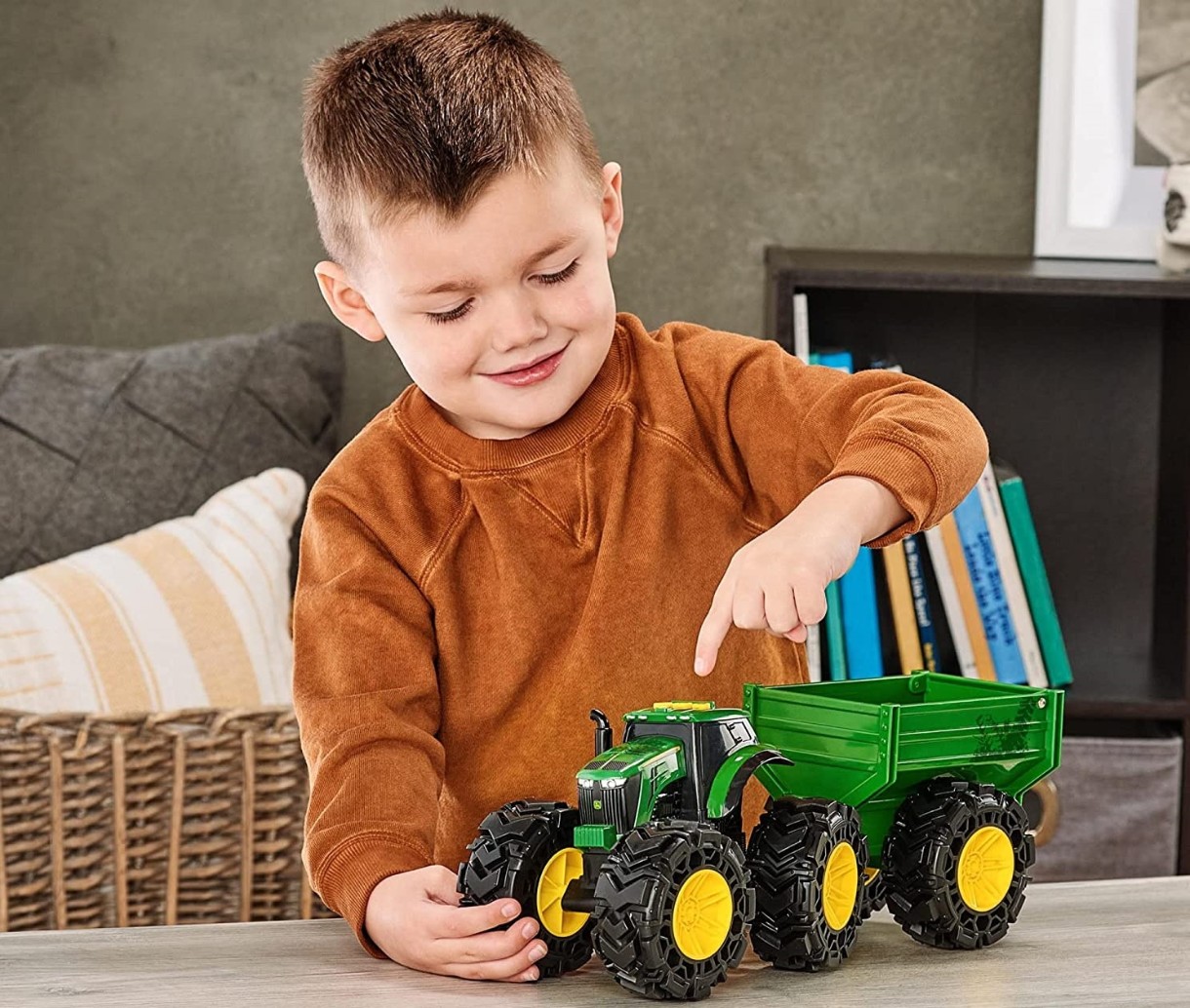 Набор «Трактор-прицеп» вдохновлен хорошо известными и оцененными машинами John Deere. И трактор, и прицеп имеют большие резиновые колеса, которые позволяют им передвигаться по различным поверхностям. Прицеп также имеет открывающийся задний погрузочный люк. На крыше кабины тракториста расположены три кнопки, отвечающие за управление световым и звуковым модулем. Игрушка имитирует звуки работы, мотора и гудка, мигает передними фарами.