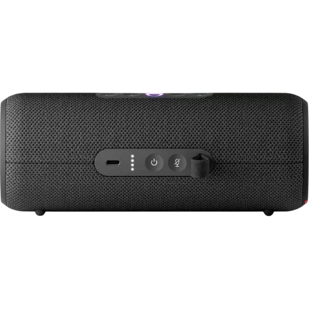 Колонка выполнена в прочном корпусе из пластика и ткани, поставляется с кабелем зарядки и карабином для крепления — удобно брать с собой в дорогу.