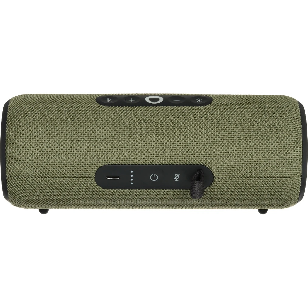 Колонка выполнена в прочном корпусе из пластика и ткани, поставляется с кабелем зарядки и карабином для крепления — удобно брать с собой в дорогу.