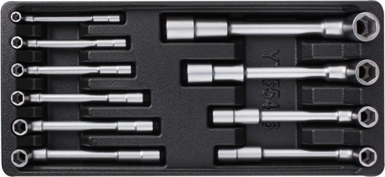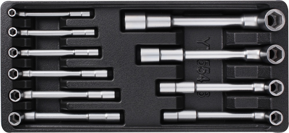 Вклад к выдвижному ящику включает 10 торцовых L-образных ключей диаметром от 7 мм до 19 мм. Торцовой L-образный ключ используется в различных сферах деятельности для проведения ремонтных или сборочных работ. Ключом можно легко справиться с откручиванием / закручиванием резьбовых соединений. Торцовый L-образный ключ позволяет равномерно протягивать крепеж, находящийся в труднодоступных местах. Высокое качество и прочность инструментальной стали обеспечивают продолжительный срок службы инструмента. Инструмент может работать с гайками на длинных шпильках. Каждый предмет в наборе имеет свое место, что значительно облегчает его использование и транспортировку.