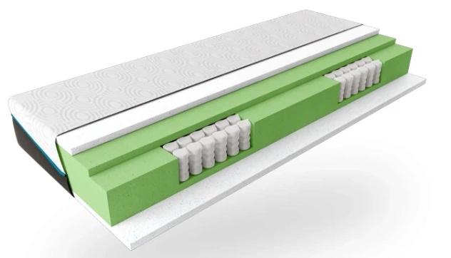 В составе матраса гармонично сочетаются свойства пенного блока и пружинных вставок. Это позволяет добиться оптимальной ортопедичности. Чувствительный пружинный блок в области плечевого пояса и коленей рассчитан на самые подвижные зоны, а эластичные зоны пен идеально поддерживают таз, голову и стопы, не нарушая кровообращение.