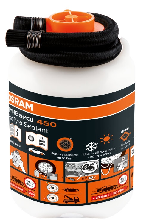 OSRAM TYREseal 450-это герметик для шин, который можно использовать в качестве замены Заводского уплотнительного оборудования от производителя. OSRAM TYREseal 450 позволяет герметизировать шины с проколами диаметр до 6 мм * благодаря технологии молекулярного геля, а затем накачать их с помощью компрессора, такого как TYREinflate 200,450 или 1000 от OSRAM. После герметизации шины гелем OSRAM TYREseal 450 вы можете продолжить путешествие на расстояние до 200 км. Герметик для шин можно промыть и починить шину, что позволит значительно сэкономить. Уплотнение поврежденной шины может выполняйте быстро и легко, без инструментов или подъемников, чтобы вы могли возобновить свое путешествие всего за 10 минут. По сравнению с пенными герметиками формула герметика OSRAM предназначена для совместимости с системой контроля давления в шинах транспортного средства (TMPS). Благодаря используемой технологии нет необходимости снимать сердечник клапана при использовании герметика. OSRAM TYREseal 450 можно использовать в качестве замены Заводского уплотнительного оборудования от производителя. Потому что большинство герметиков шин следует заменять каждые 5 лет, включая те, которые поставляются на заводе в автомобиле запасная бутылка OSRAM TYREseal 450 — идеальный способ заменить герметик для шин вашего автомобиля после истечения срока годности. OSRAM TYRESEAL 450 и OSRAM TYRESEAL KIT — это герметики для шин OSRAM, которые используют технологию молекулярного геля для герметизации проколов шин и производятся в соответствии с стандарт OE автопроизводителей. Доступный как набор, это OSRAM TYRESEAL KIT, с герметиком Gel, компрессором и крышкой или как OSRAM TYREseal 450, это как бутылка геля прокладки.